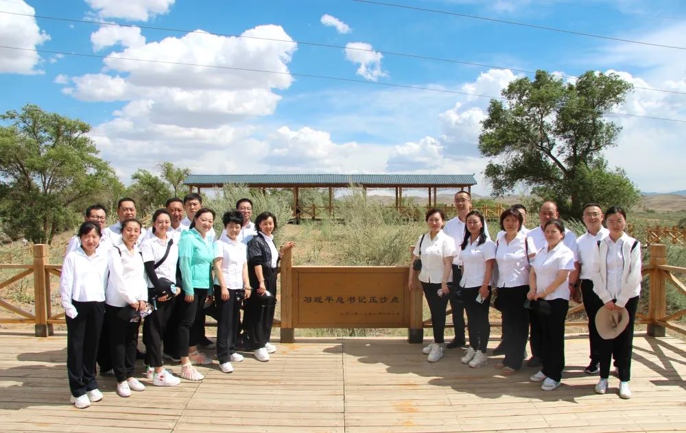 隨后,全體黨員走進八步沙林場實地參觀了沙漠變綠洲的治沙新面貌,重走習近平總書記視察之路——揮鍬治沙壓沙點原址。