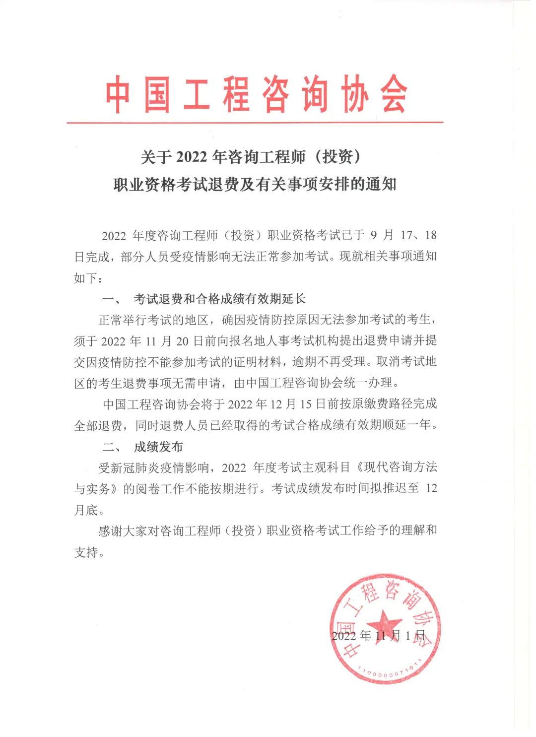 中國工程咨詢協會關于2022年咨詢工程師(投資)職業資格考試退費及有關事項安排的通知