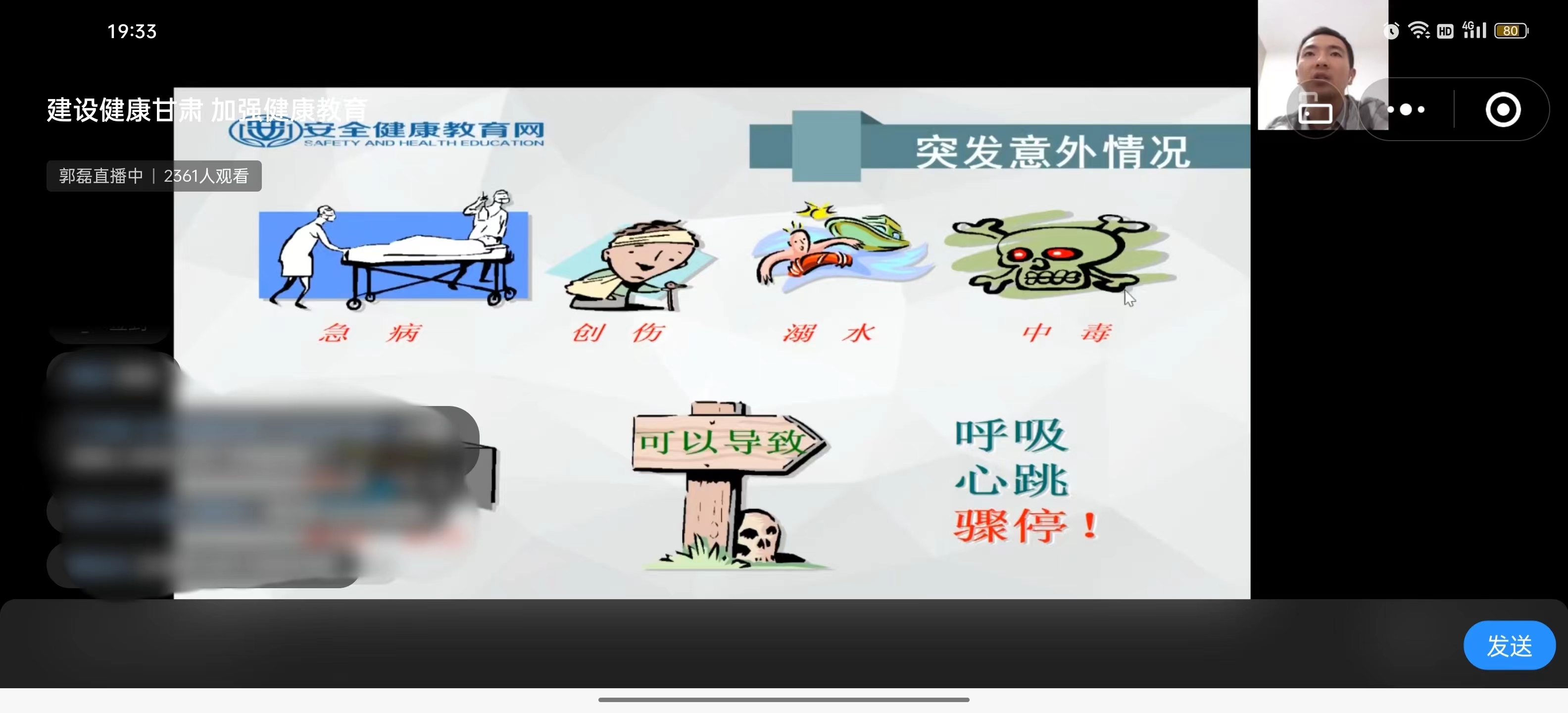 此次講座采取線上直播方式進行,由安全健康教育網宣教科主任郭磊主講,郭主任從突發意外事故應急處理及常規急救技能、對疫情的正確認識與科學的防疫方法及心理壓力疏導與健康的生活方式三個方面內容并結合實際案例詳細講述了日常生活中的急救知識和疫情防控的正確方法。