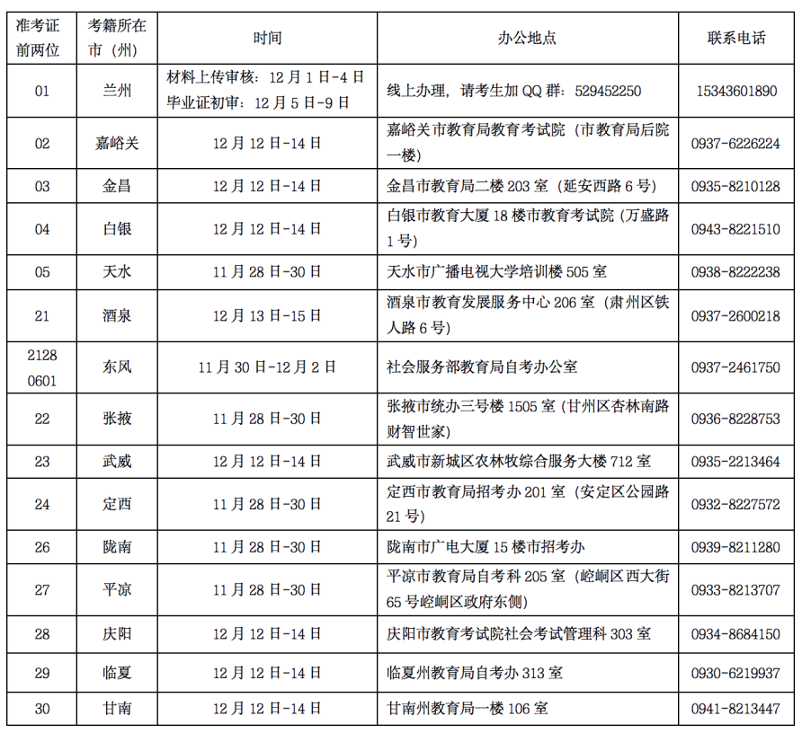 附:2022年下半年甘肅省高等教育自學考試社會型考生各市州畢業初審時間及聯系方式