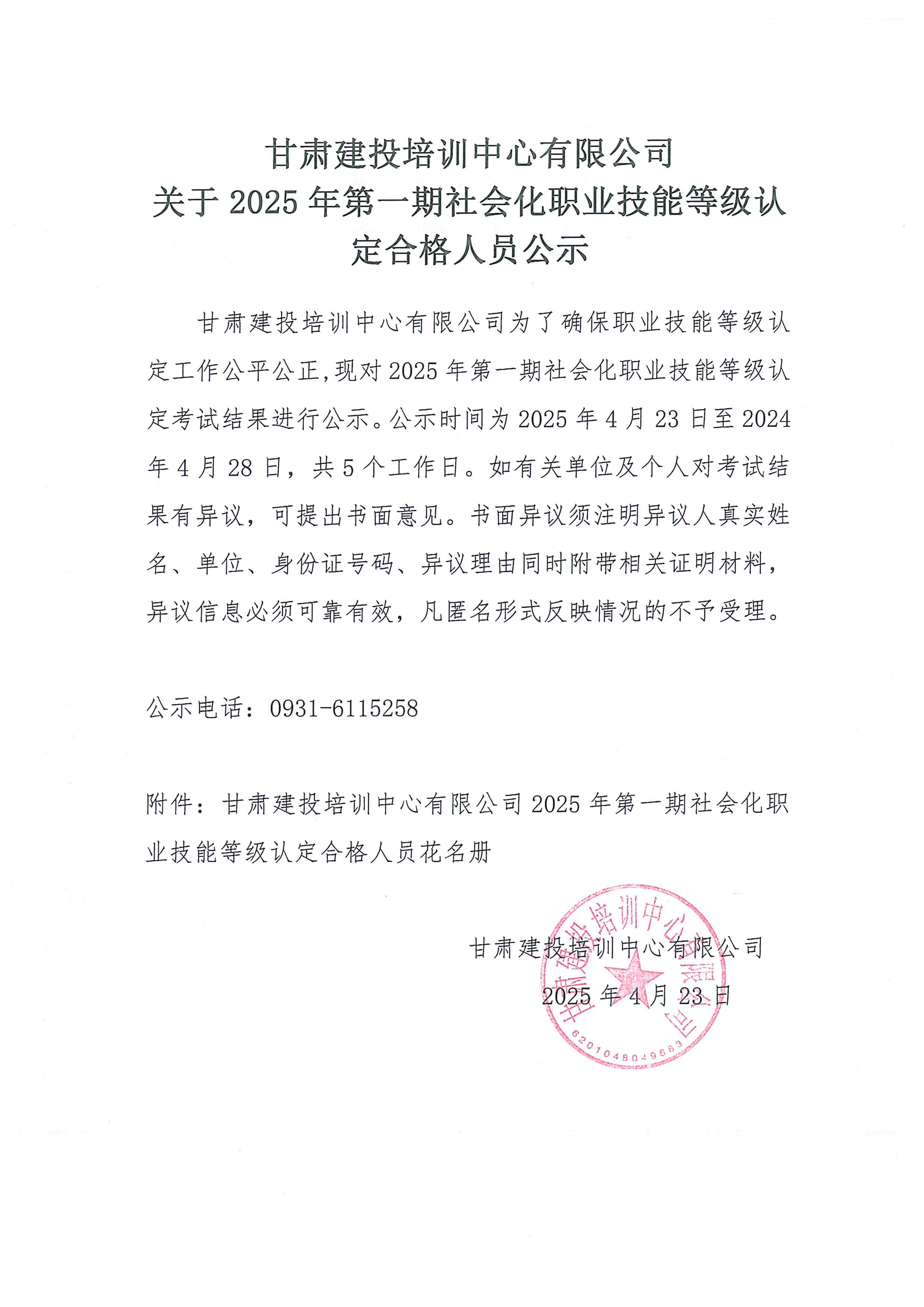 甘肅建投培訓中心有限公司關于2025年第一期社會化職業技能等級認定合格人員公示