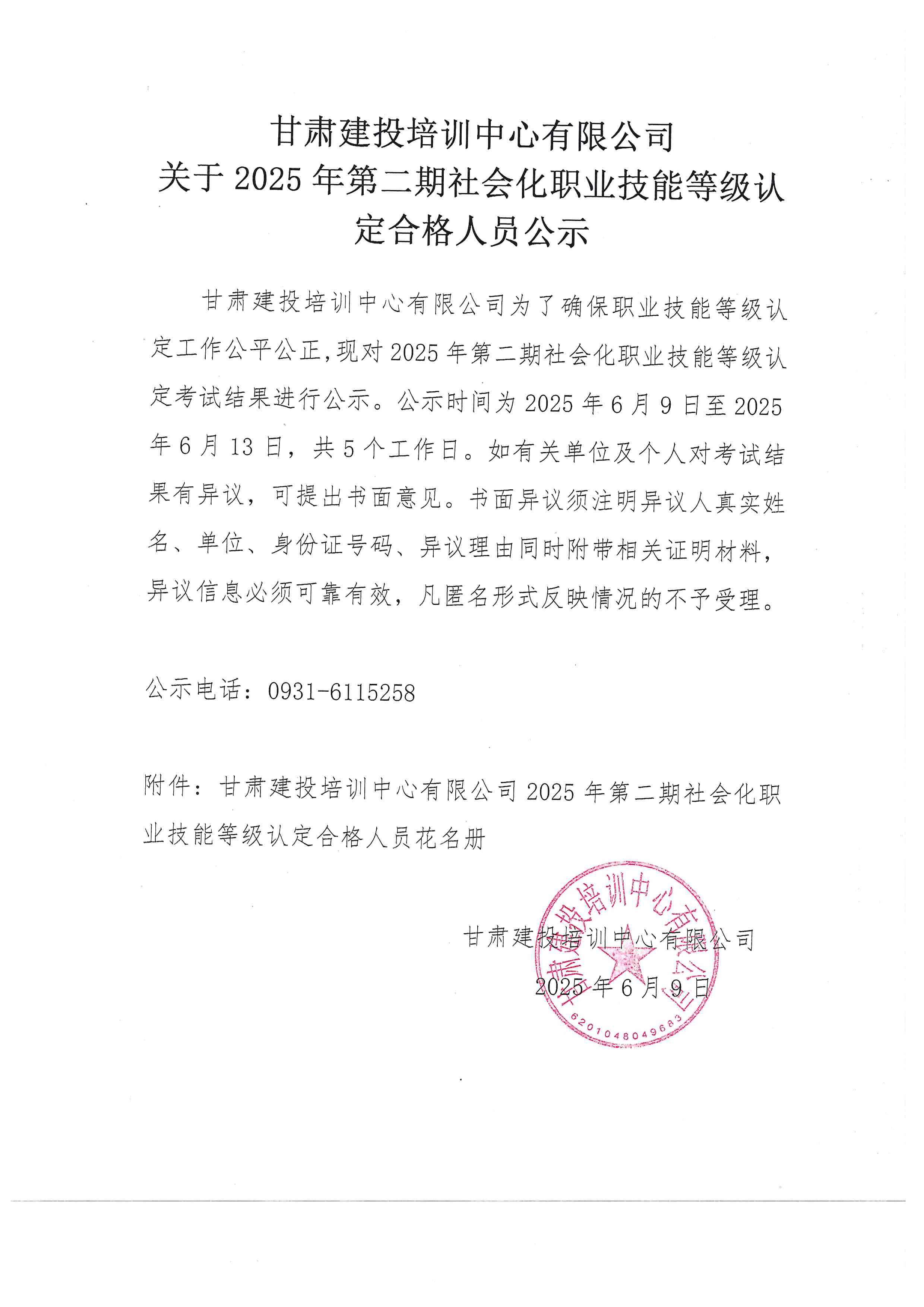 甘肅建投培訓(xùn)中心有限公司關(guān)于2025年第二期社會(huì)化職業(yè)技能等級(jí)認(rèn)定合格人員公示