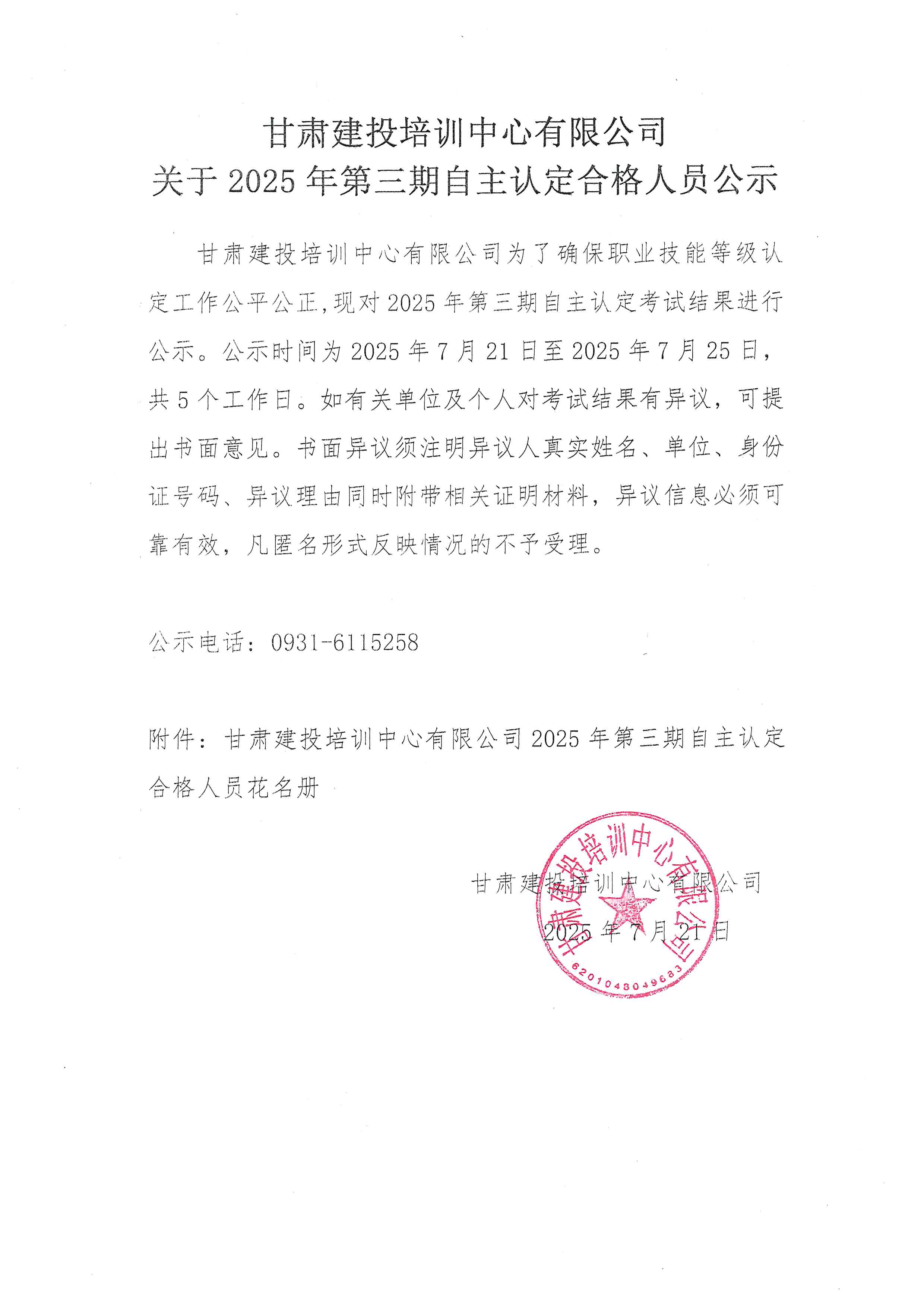 甘肅建投培訓中心有限公司 關于2025年第三期自主認定合格人員公示