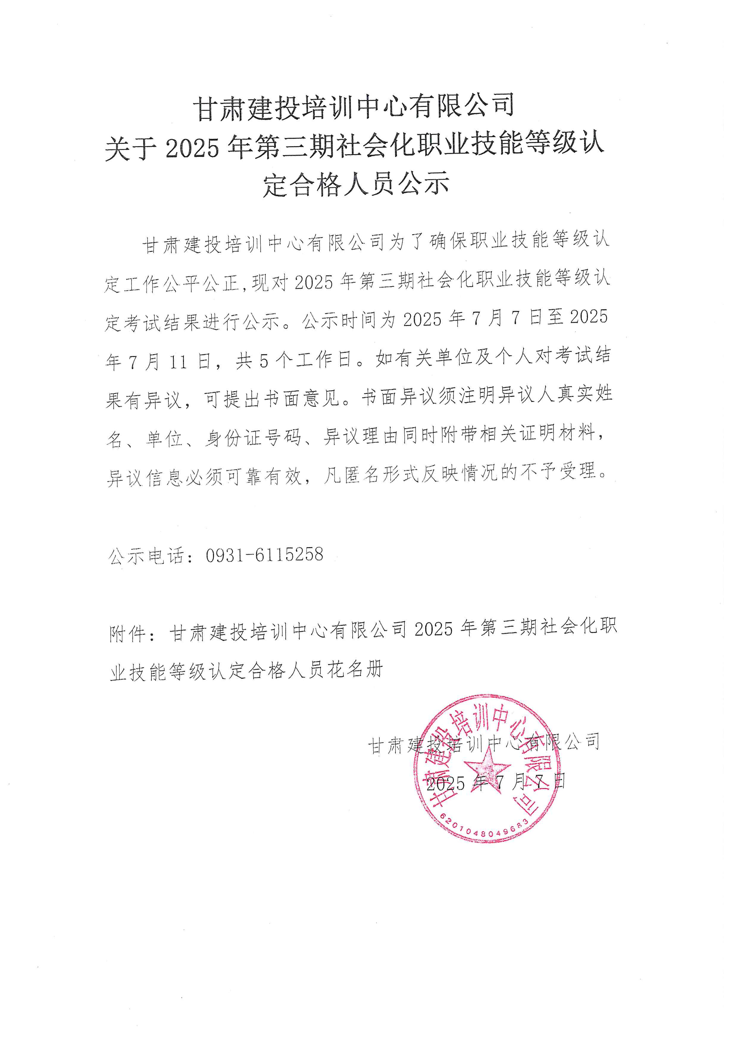 甘肅建投培訓中心有限公司關于2025年第三期社會化職業技能等級認定合格人員公示