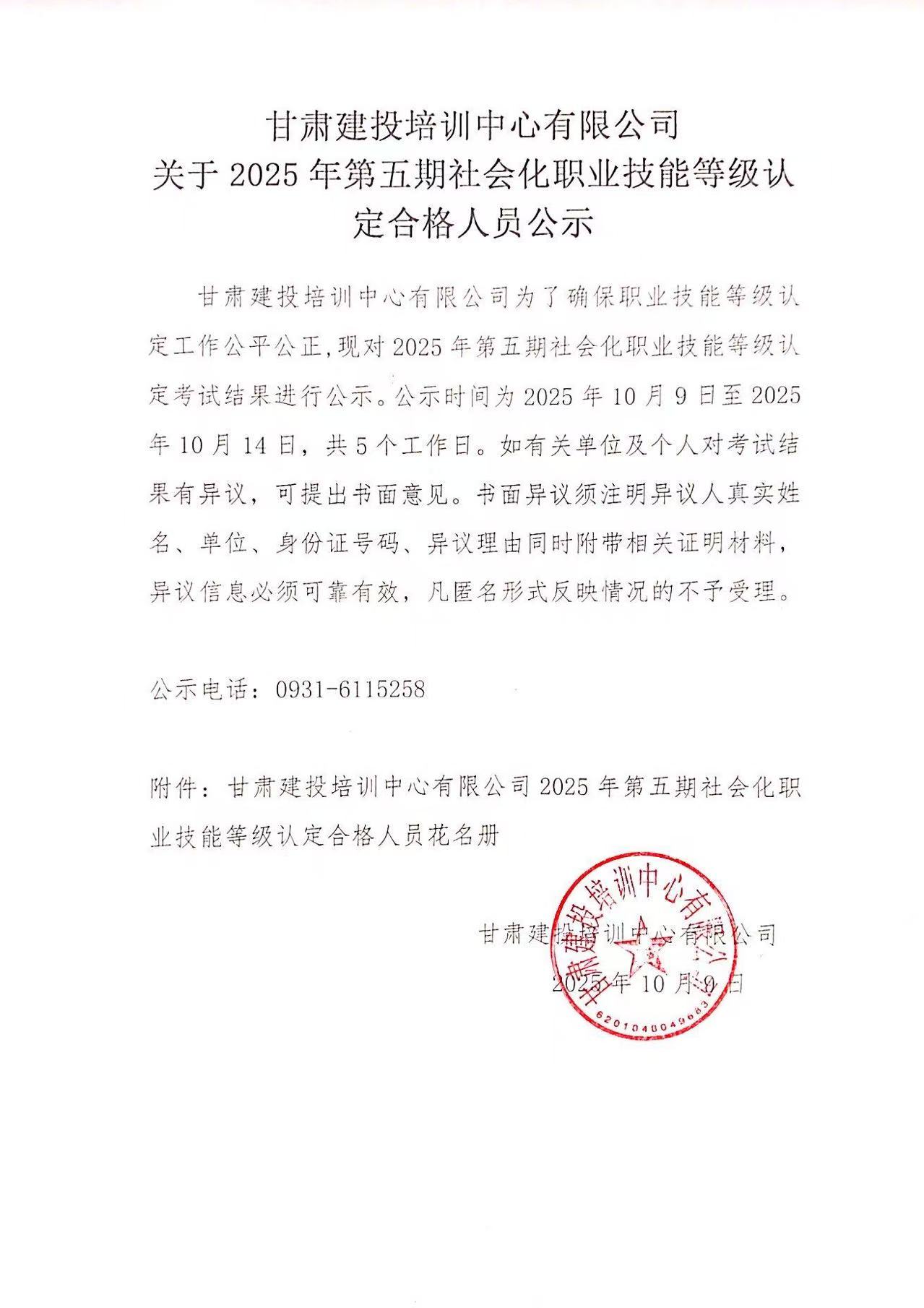 甘肅建投培訓中心有限公司關于2025年第五期社會化職業技能等級認定合格人員公示